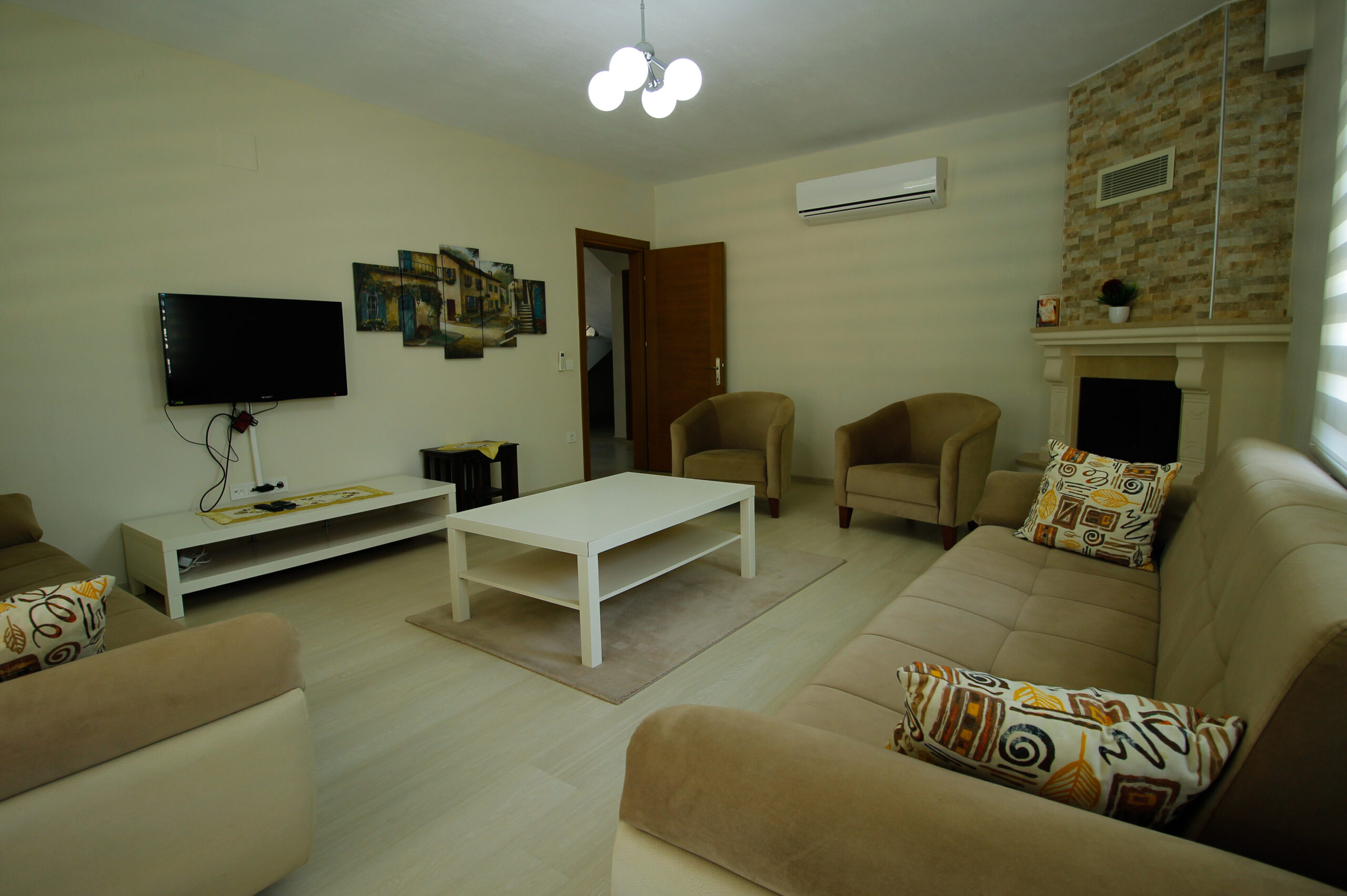 Our villa, with a usable area of 220 m2, has an en-suite bathroom in one bedroom and TVs in all rooms. The bedrooms are air-conditioned. The living room also has air conditioning and a TV. We also have two shared bathrooms, a barbecue area, and private parking.