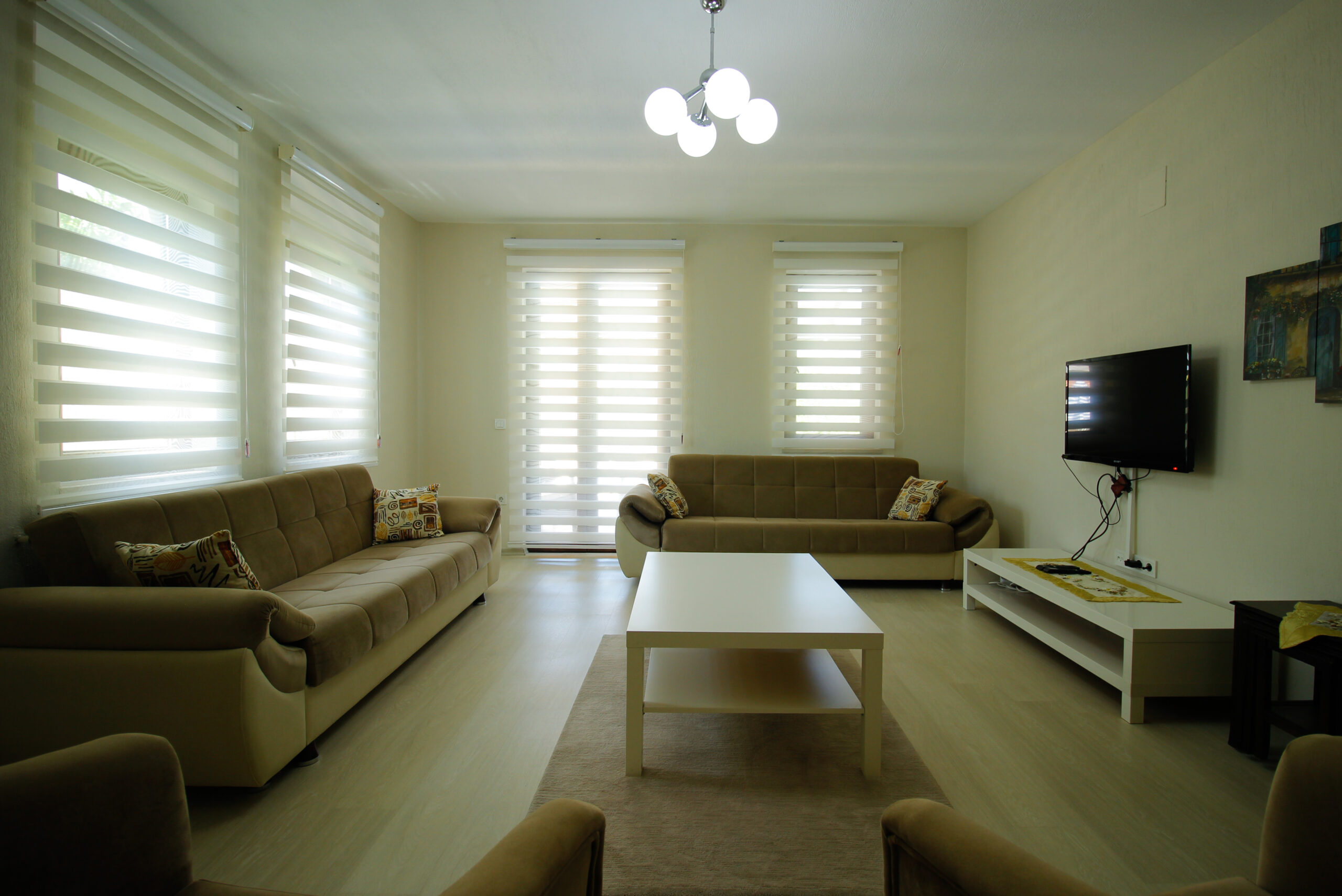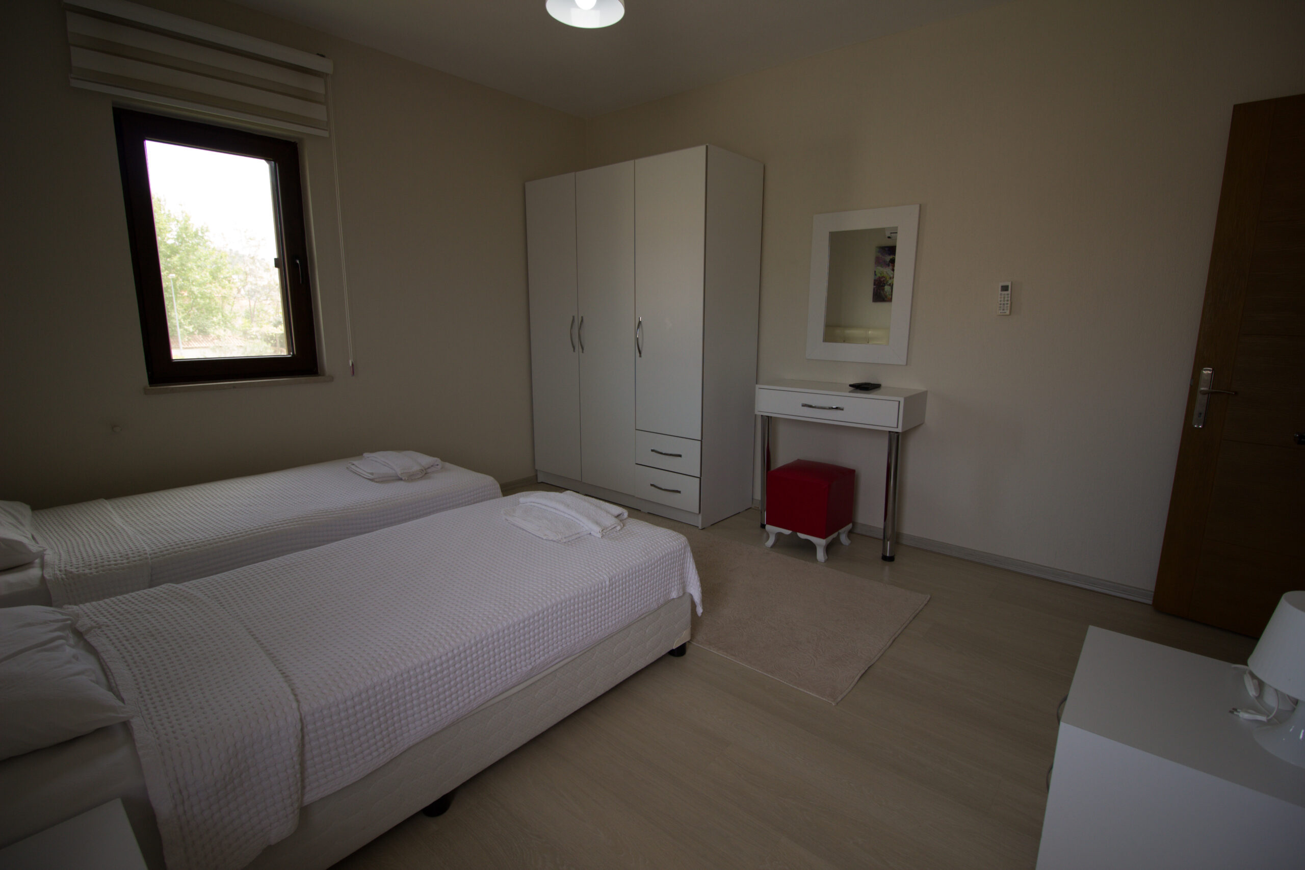Our villa, which can accommodate 8 people, has a total of 4 bedrooms and 1 living room. Two of the bedrooms have double beds, and the other two have two single beds each.