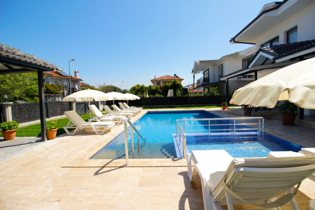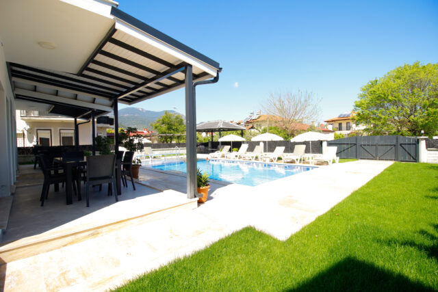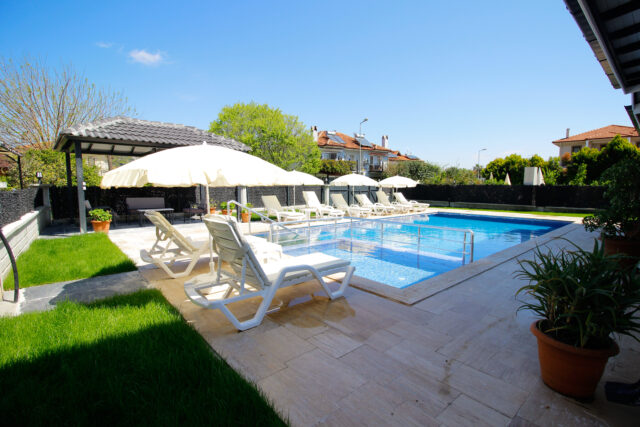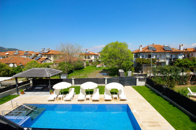 This holiday home, number 542, is located 900 meters from the center of Dalyan, Muğla. It features a 50 m² private pool with a depth of 1.5 meters, and a 5 m² children’s pool with a depth of 70 cm.